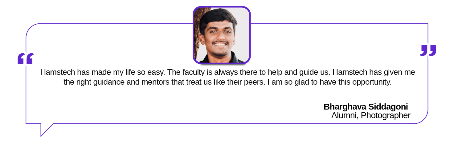 Photography is an art of capturing moments that speak. Photography courses at Hamstech aim to provide enthusiastic photographers an experiential learning experience and helps them to inculcate professional skills with geometry and capturing emotion. The photography classes include an industry-endorsed curriculum under the guidance of industry experts and celebrity mentor Avinash Gowariker (Celebrity photographer).